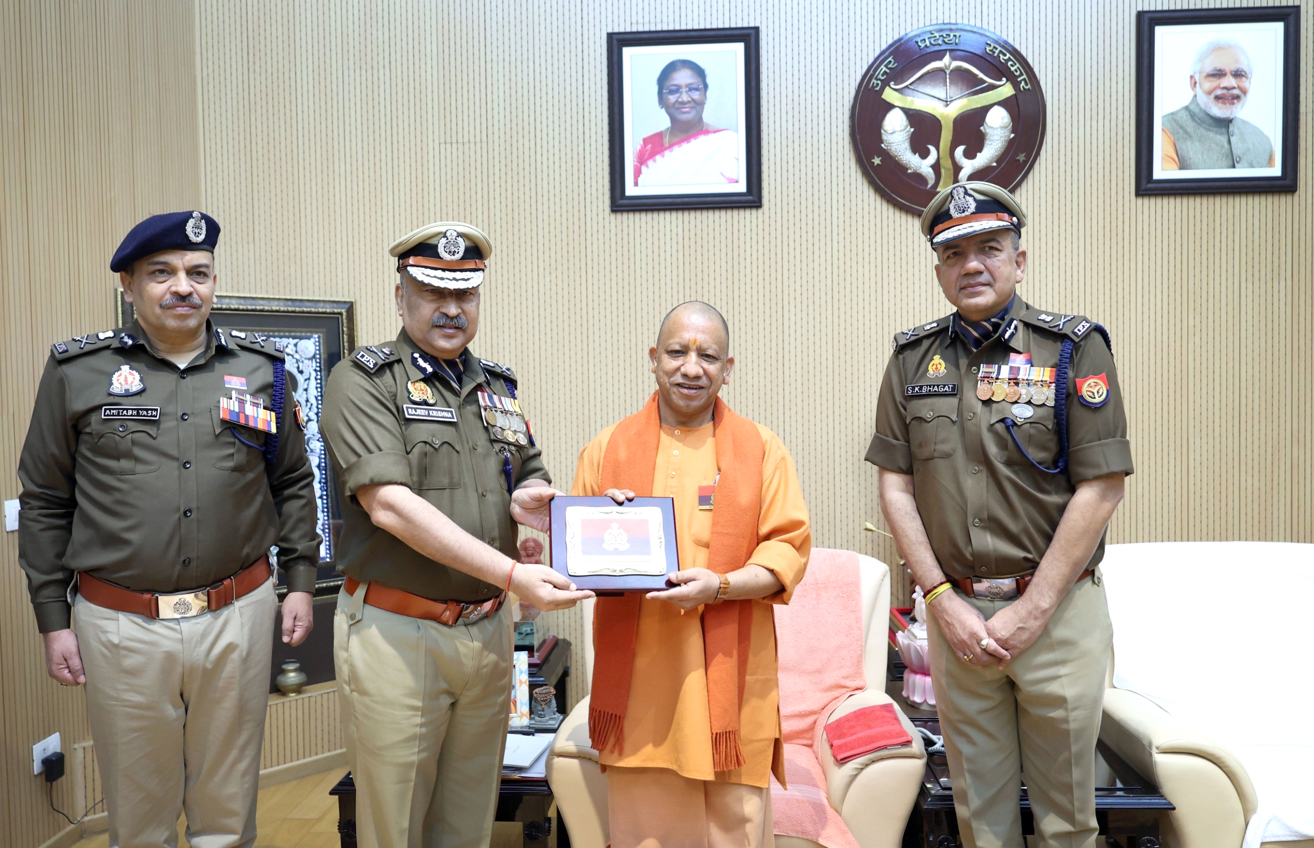 झंडा दिवस पर डीजीपी ने सीएम योगी को फ्लैग लगाकर किया सम्मानित, भेंट किया स्मृति चिन्ह