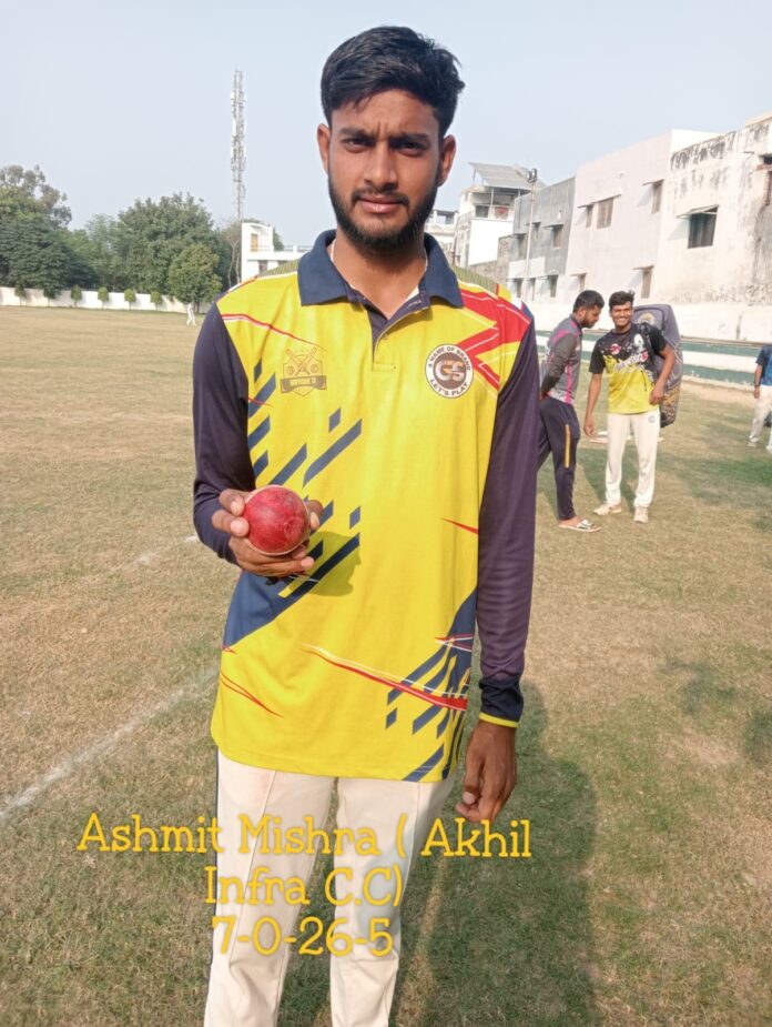 शिवम पाण्डेय (50 रन, 46 गेंद, 8 चौके) व सात्विक राव (51 रन, 73 गेंद, 7 चौके) ने अर्धशतकीय पारियां खेलते हुए टीम को मजबूत शुरुआत दी। इसके बाद अस्मित की गेंदों के आगे आदित्य पाण्डेय 26 व सूफियान खान 17 रन जोड़कर ही कुछ प्रतिरोध कर सके। अखिल इंफ्रा से अस्मित मिश्रा (स्पोर्ट्स गैलेक्सी क्रिकेट अकादमी के प्रशिक्षु) ने 7 ओवर में 26 रन देकर आधी टीम को पवैलियन वापस भेजा।