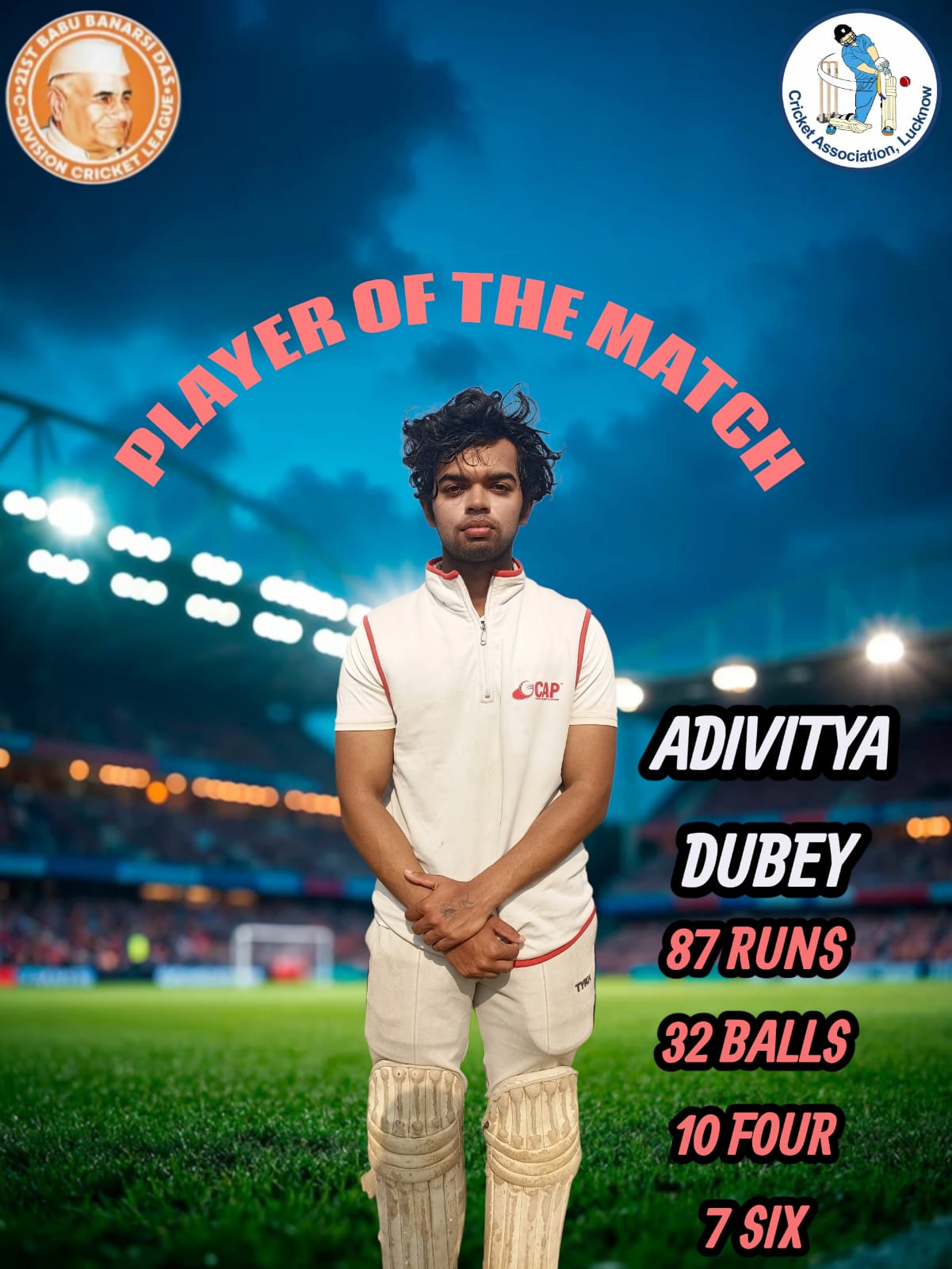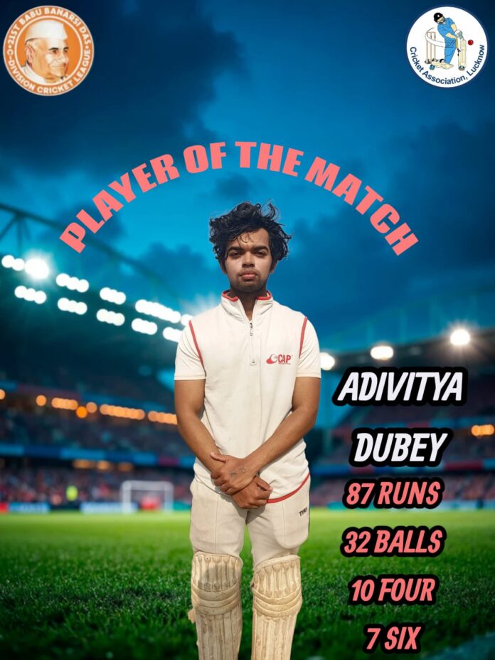 लखनऊ। शिवा सिंह की धारदार गेंदबाजी (4 विकेट) के बाद मैन ऑफ द मैच अद्वितीय दुबे (नाबाद 87,32 गेंद, 10 चौके व 7 छक्के) की ताबड़तोड़ अर्धशतकीय पारी की बदौलत इंटरनेशनल स्पोर्ट्स क्लब ने 21 वीं बाबू बनारसीदास क्रिकेट लीग डिवीजन सी के लीग मुकाबले में दिव्युग आश्रम को 10 विकेट से मात देकर धमाकेदार जीत दर्ज की।
