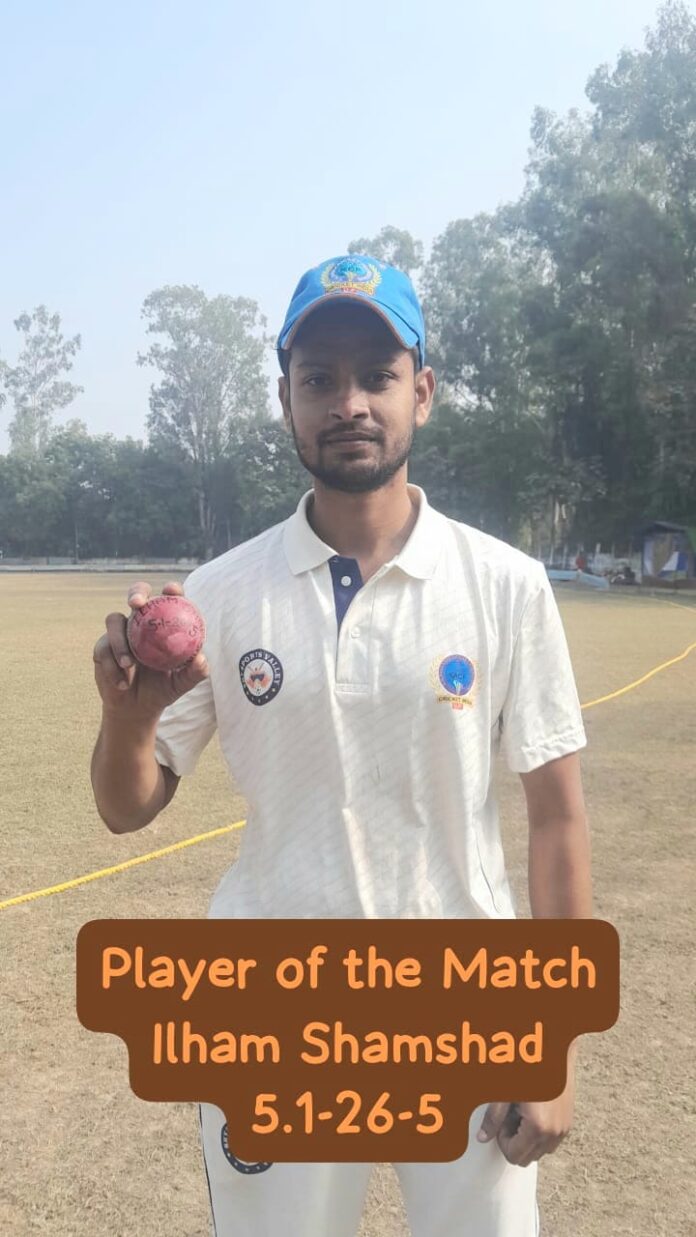 ओम स्पोर्ट्स क्लब की ओर से सलामी बल्लेबाज अनुराग चौधरी ने 51 रन की संघर्षपूर्ण पारी खेली, लेकिन अन्य बल्लेबाज टिककर नहीं खेल सके। लक्ष्मण सिंह क्रिकेट क्लब की ओर से इलहाम शमशाद ने शानदार गेंदबाजी करते हुए पांच विकेट झटके, जबकि मोहित त्रिवेदी को दो विकेट मिले।