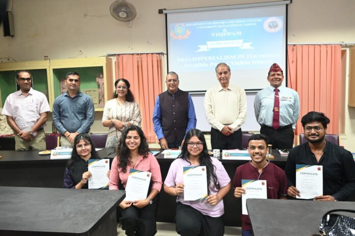 जयपुर। इक्कीसवीं सदी में वैश्विक स्तर पर उभरते नवसाम्राज्यवाद की अदृश्य ताकतों और उनके दृश्यमान प्रभावों को लेकर शनिवार को राजस्थान विश्वविद्यालय में आयोजित एक सिम्पोजियम में विशेषज्ञों ने गंभीर चिंताएं व्यक्त कीं। ‘ग्लोबल डायलॉग फोरम – विश्वम’ और राजस्थान विश्वविद्यालय के इतिहास विभाग के संयुक्त तत्वावधान में हुए इस कार्यक्रम का विषय — ‘इक्कीसवीं सदी में नवसाम्राज्यवाद: इनविजिबल पावर, विजिबल इंपैक्ट’ था।