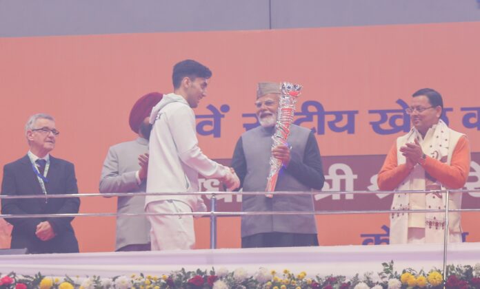 देहरादून। देवभूमि उत्तराखंड की राजधानी में मंगलवार को 38वें राष्ट्रीय खेलों का भव्य आगाज हुआ। विभिन्न लेजर शो के बीच आयोजित इस उद्घाटन समारोह में प्रधानमंत्री नरेन्द्र मोदी ने राष्ट्रीय खेलों की मशाल ‘तेजस्विनी’ को ग्रहण किया, जिसे अंतर्राष्ट्रीय बैडमिंटन खिलाड़ी लक्ष्य सेन ने उन्हें सौंपा। इस अवसर पर पूरे देश से आई पैंतीस खिलाड़ी टीमों ने अपने ध्वजों के साथ शानदार मार्च पास्ट किया।