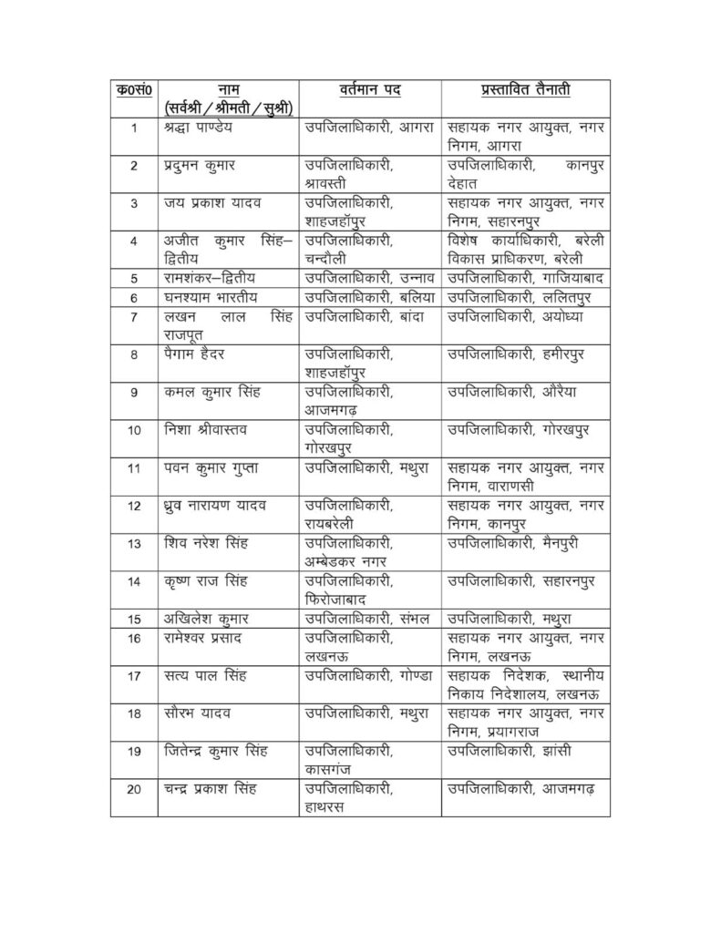प्रमुख तबादले में श्रद्धा पांडेय, एसडीएम आगरा को आगरा नगर निगम में सहायक नगर आयुक्त के पद पर तैनात किया गया है। प्रदुमन कुमार, उपजिलाधिकारी श्रावस्ती को कानपुर देहात का एसडीएम बनाया गया है।जयप्रकाश यादव, शाहजहांपुर के एसडीएम को सहारनपुर नगर निगम में सहायक नगर आयुक्त के पद पर भेजा गया है।