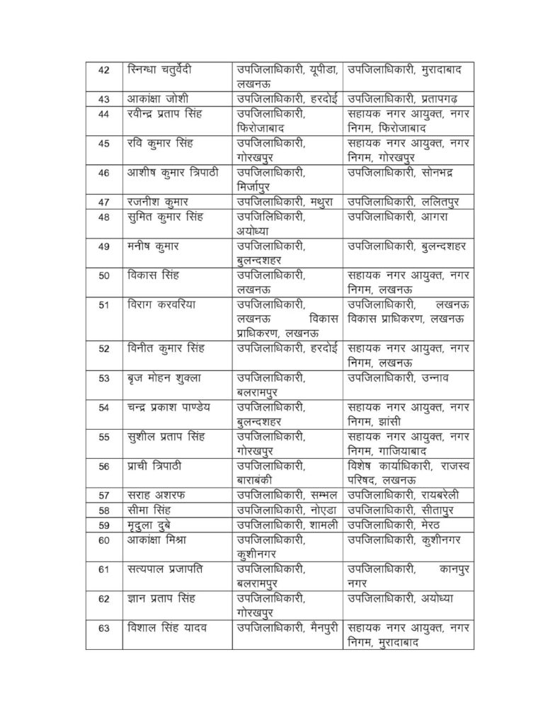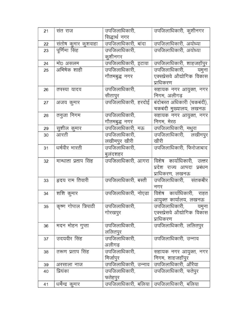 लखन लाल सिंह राजपूत, बांदा के एसडीएम को अयोध्या में उपजिलाधिकारी नियुक्त किया गया है।पैगाम हैदर, शाहजहांपुर के एसडीएम को हमीरपुर में उपजिलाधिकारी के रूप में नई जिम्मेदारी दी गई है।कमल कुमार सिंह, आजमगढ़ के एसडीएम को औरैया के एसडीएम पद पर तैनाती मिली है।निशा श्रीवास्तव, गोरखपुर की एसडीएम को गोरखपुर में ही उनकी तैनाती यथावत रखी गई है। इसके अतिरिक्त शेष 56 अफसरों को भी विभिन्न जनपदों, प्राधिकरणों और प्रशासनिक विभागों में नई जिम्मेदारियां सौंपी गई हैं।